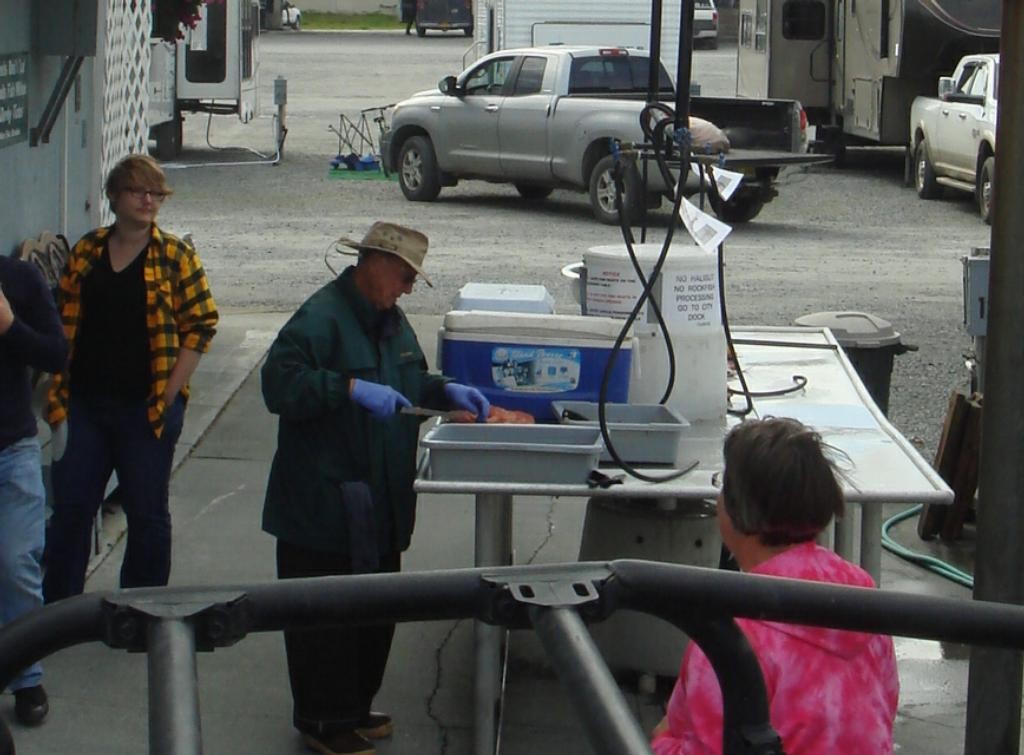 Previous ImageNext Image GK-salmon-prep The RV park had a communal salmon dinner. They provided salmon for all, and everybody else brought side dishes. A very nice benefit.