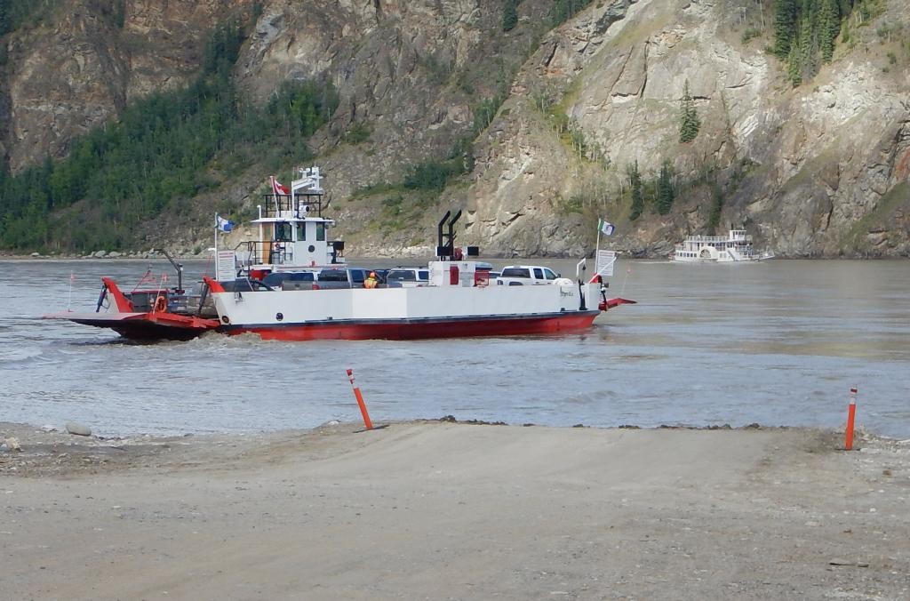 Previous ImageNext Image DW-ferry Lack of a bridge across the Yukon River requires a trip on this free ferry. Tourist paddle wheeler in the background.